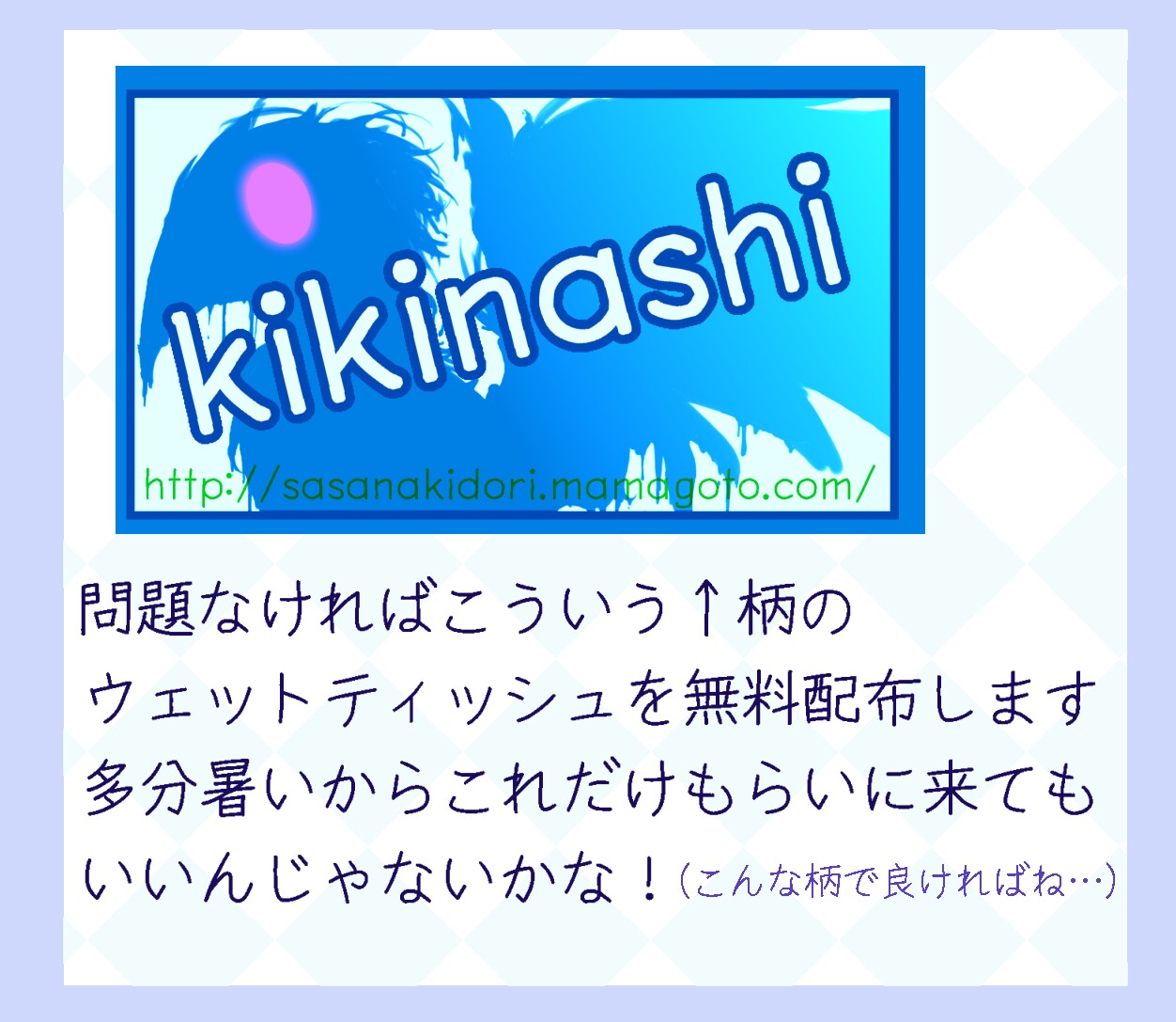 2014/06/07 Category : 未選択 6/8新潟コミティア!! 前日というかあと数十分で日付変わるんですけど今更告知です!! 新潟コミティア41にササナキドリ出ます! 新刊はないんですけど、代わりにおまけ用意しました。 問題なかったのでウェットティッシュあります! お手拭き汗ふきにどうぞご活用ください。 あとペーパーもあります。 これらをもらいに来るだけでも、立ち読みだけでもいいですとも。 それでは新潟でお会いしましょう!! 雨、酷くなければいいなあ… [0回]